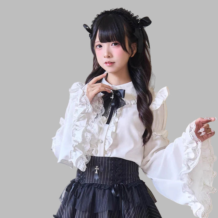 Balti gotikiniai marškiniai su juodais nėriniais ir kaspinu Jirai Kei Lolita