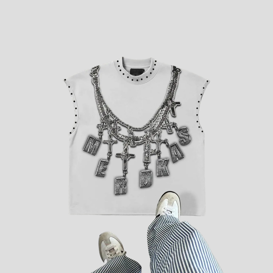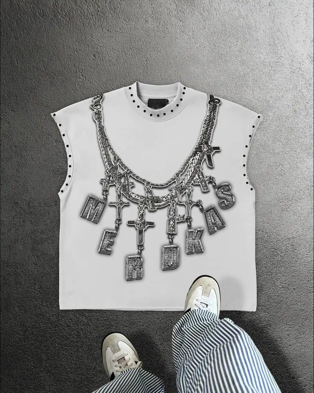 Balti marškinėliai su grandinėlių grafika, punk stilius, metalinė