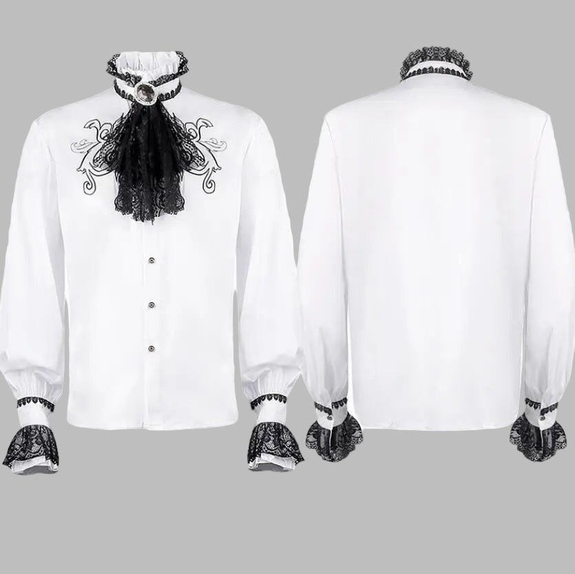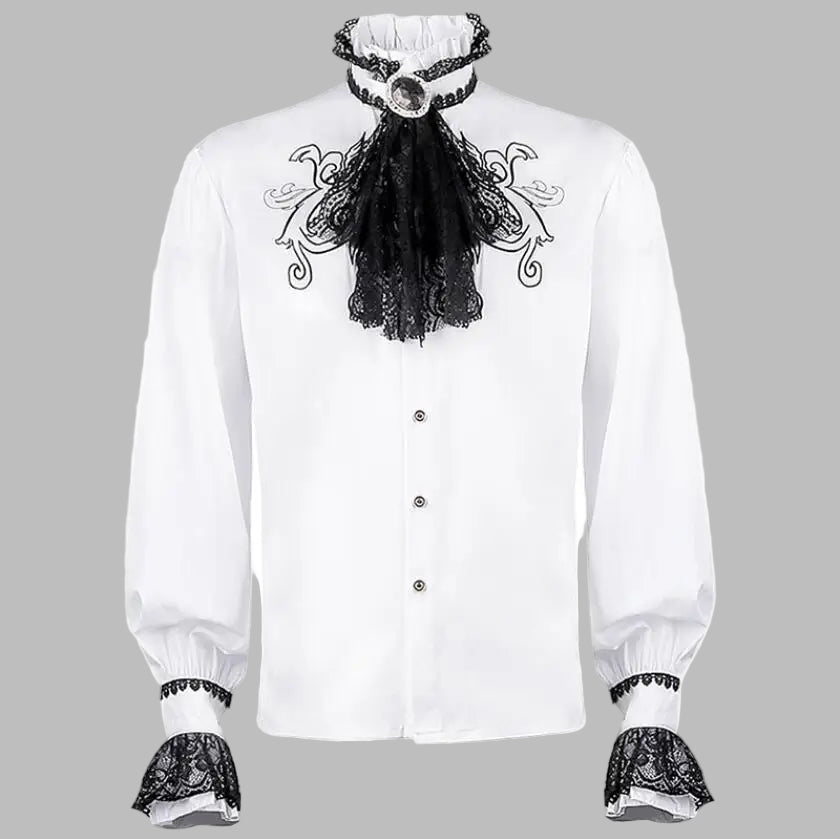 Balti steampunk marškiniai su nėrinių detalėmis ir jabotu