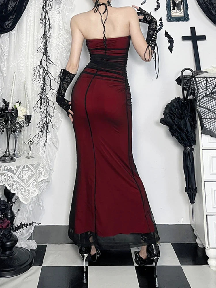 Bordo ilga gotikinė suknelė undinė su skeltuku ir nėriniais Peržiūrėti parinktis
