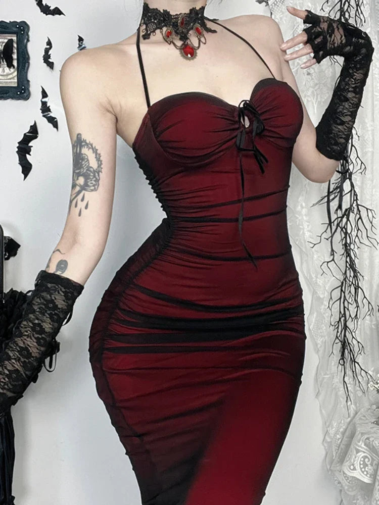Bordo ilga gotikinė suknelė su nėriniais ir skeltuku