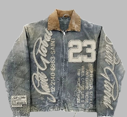 Džinsinis švarkas su užrašais ir kniedėmis, Rock Grunge Metal stiliaus, Vintage Peržiūrėti parinktis