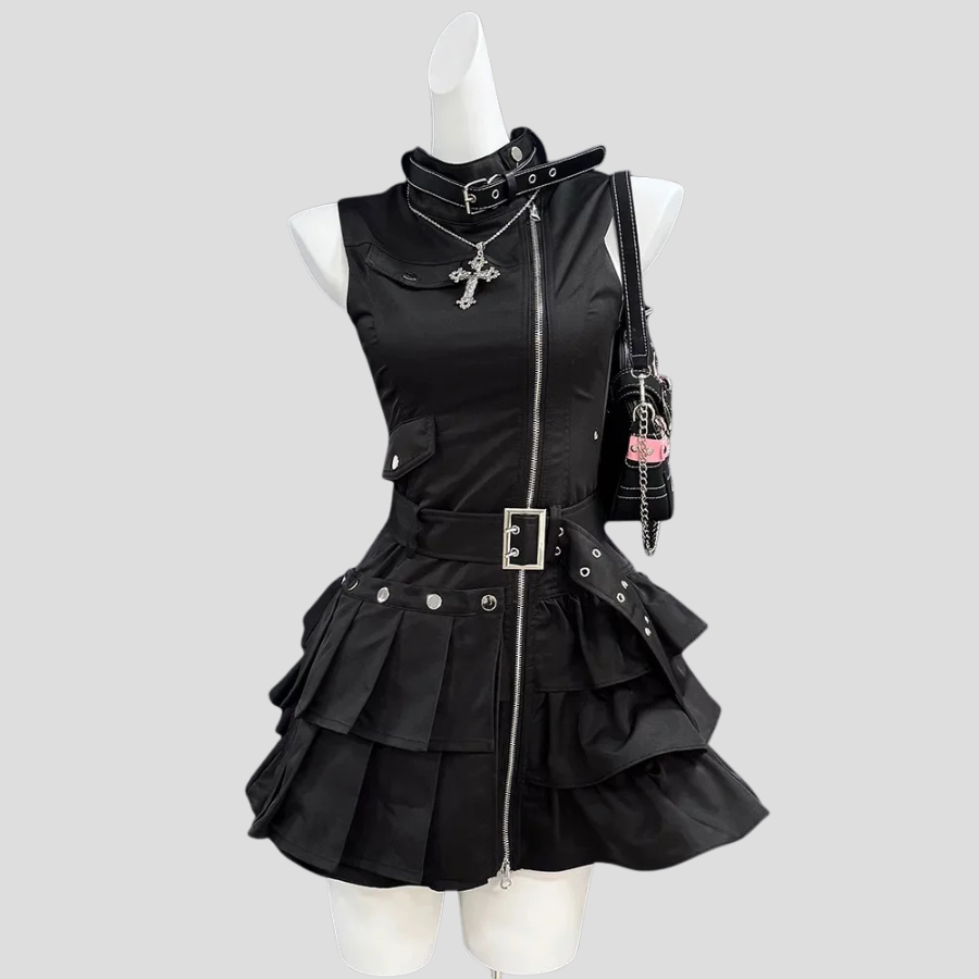 Gotikinė juoda suknelė su juostelėmis ir užtrauktuku, moteriška su raukiniais