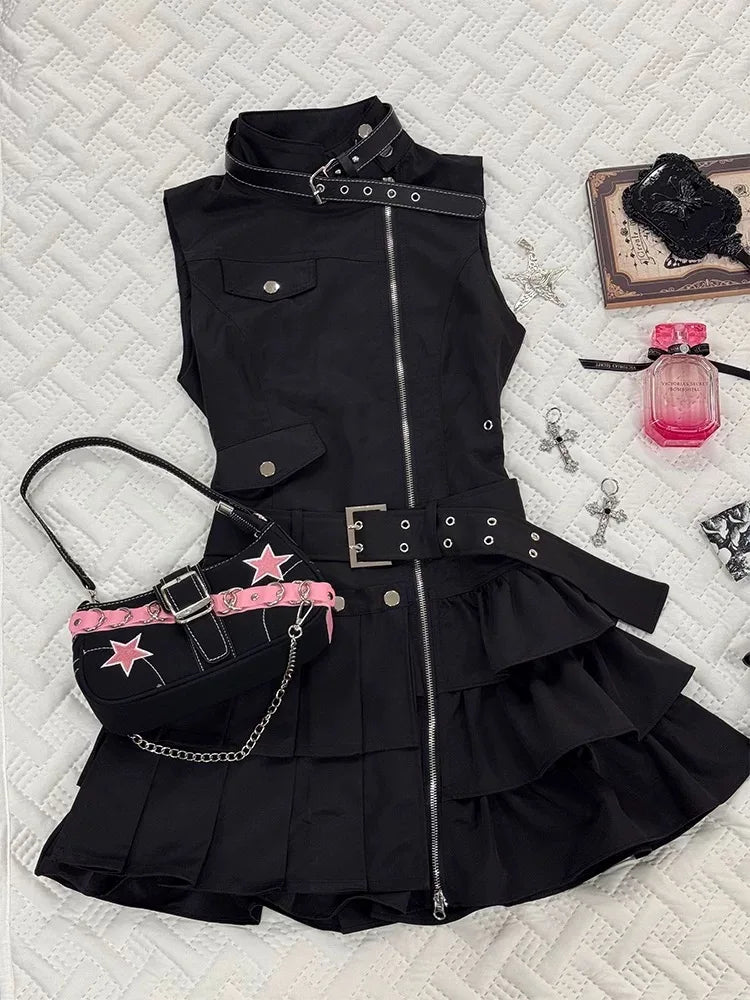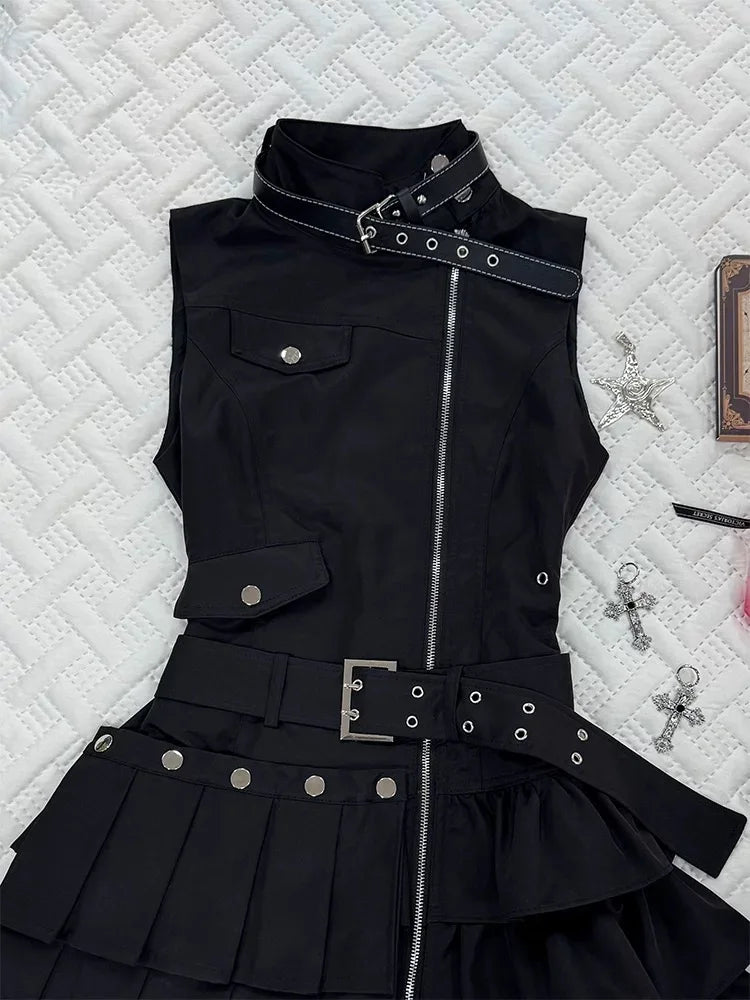 Gotikinė Suknelė Juoda Juostelės Užtrauktukas Raukiniai Moteriška