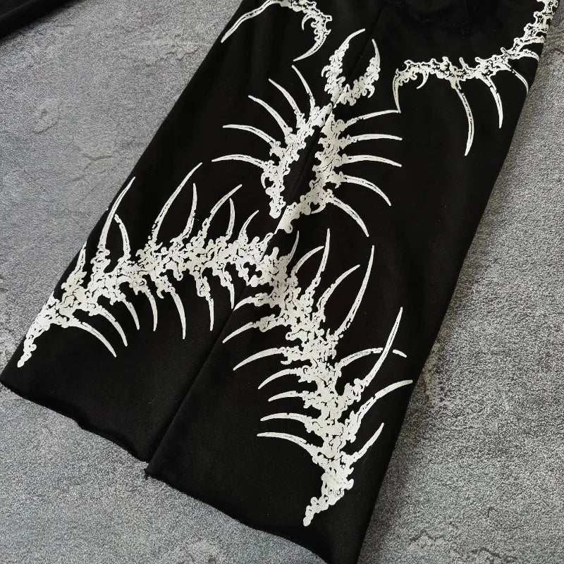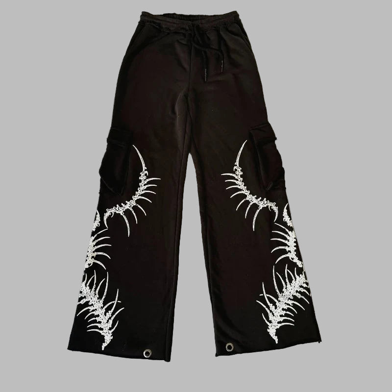 Gotikinės grunge kelnės su skeletų kaulų raštu darkwear stiliaus
