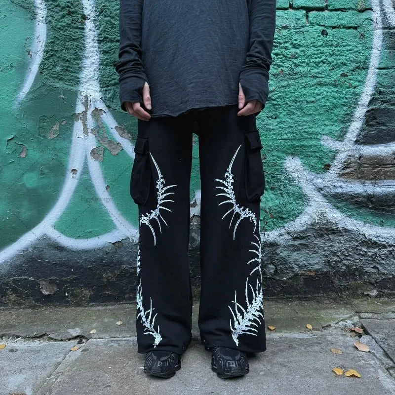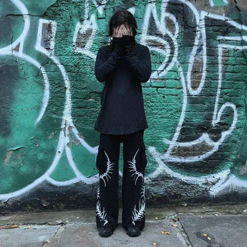 Gotikinės grunge kelnės su skeletų kaulų raštu darkwear stilius