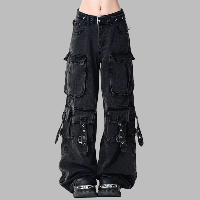 Gotikinės juodos kelnės su kišenėmis, dirželiais ir sagtimis Cargo