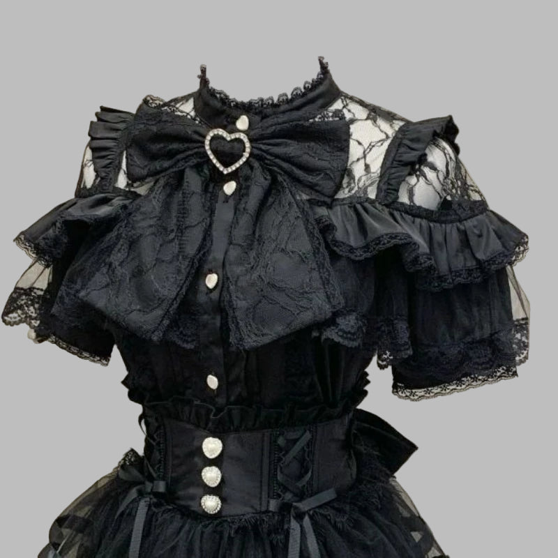 Gotikiniai juodi nėriniuoti marškiniai su kaspinu ir korseto diržu