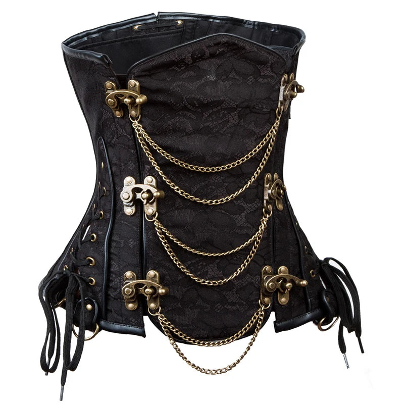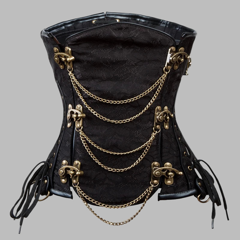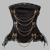 Gotikinis punk korsetas juodas su grandinėmis auksinėmis sagtimis steampunk