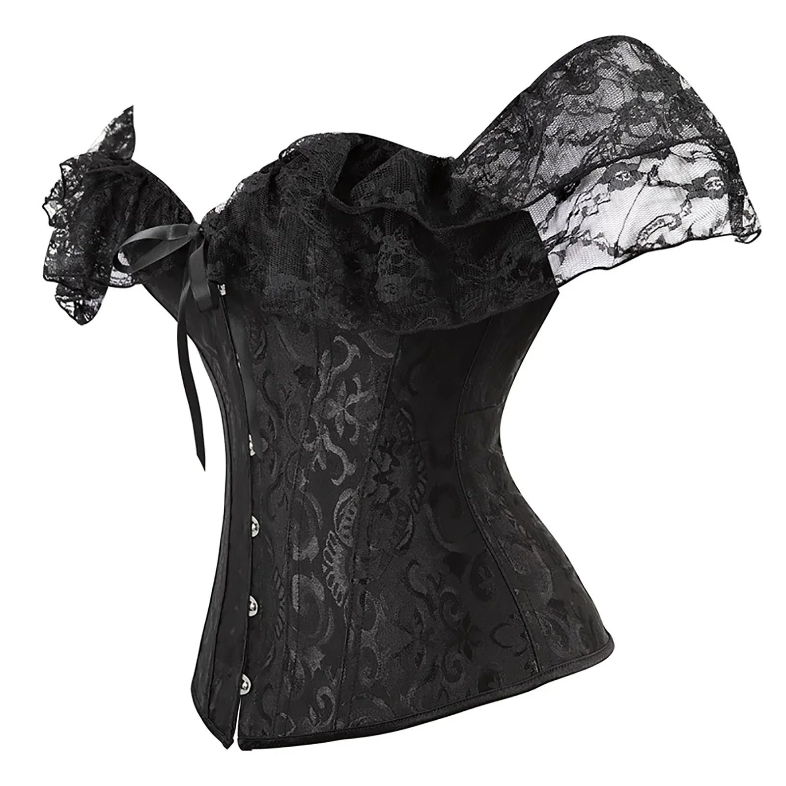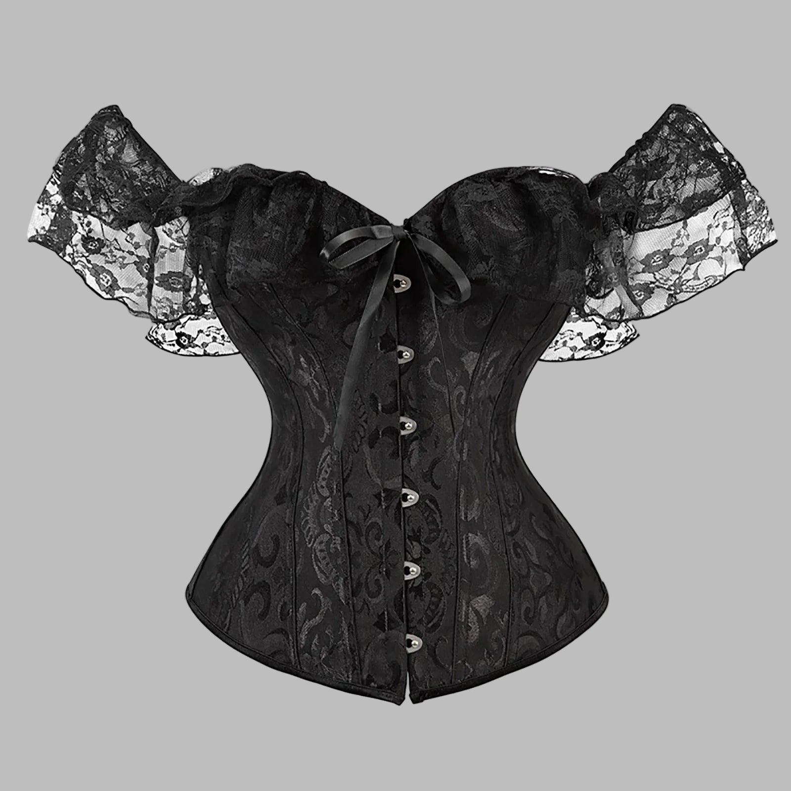 Gotikinis punk roko juodas korsetas su blizgučiais, nėriniuotomis rankovėmis ir raišteliais