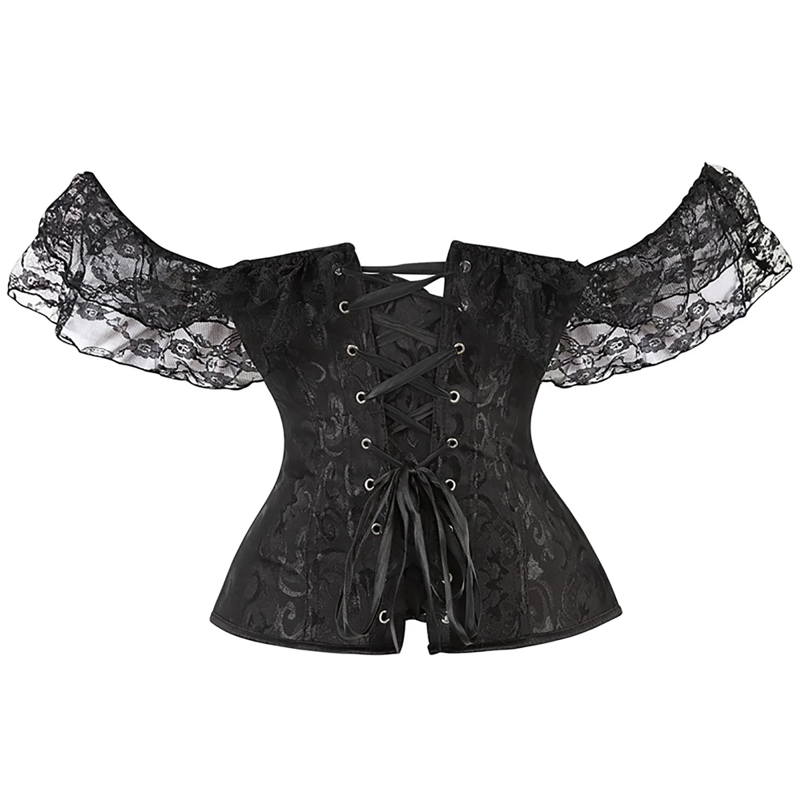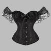 Gotikinis punk roko juodas korsetas su blizgučiais, nėriniuotomis rankovėmis ir suvarstymu