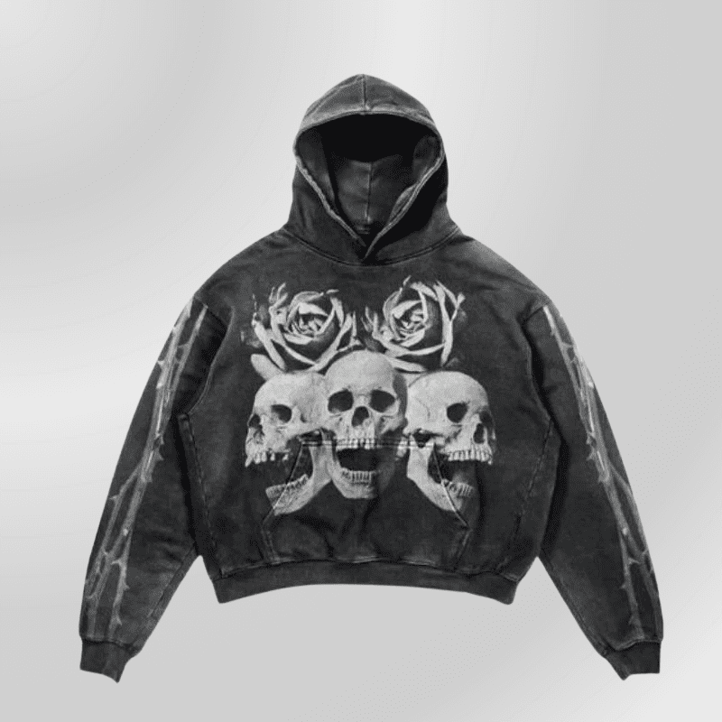 Grunge stiliaus džemperis su gobtuvu „Flower“ su skeletu