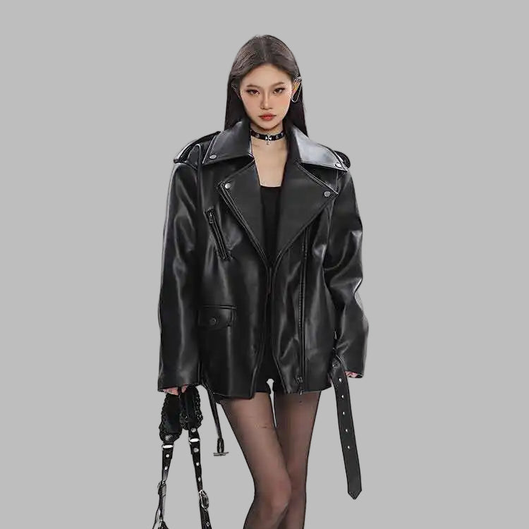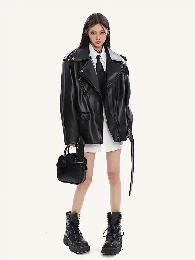 Ilga juoda gotikinė odinė oversize moteriška vintage striukė
