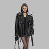 Ilga juoda gotikinė odinė oversize stiliaus moteriška striukė vintage stiliaus