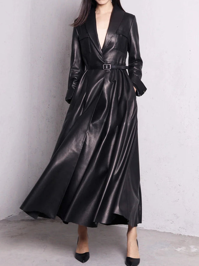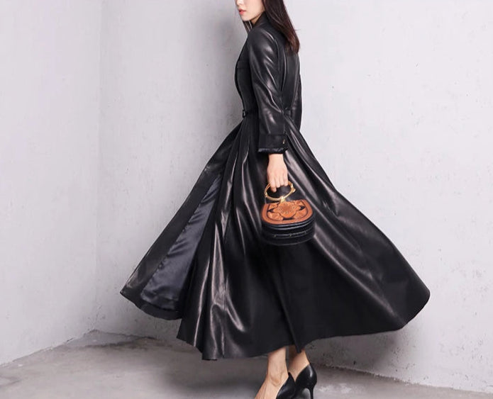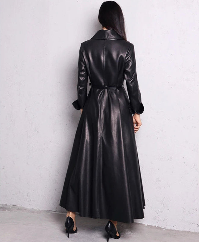 Ilgas juodas elegantiškas odinis paltas Metal Goth Rock