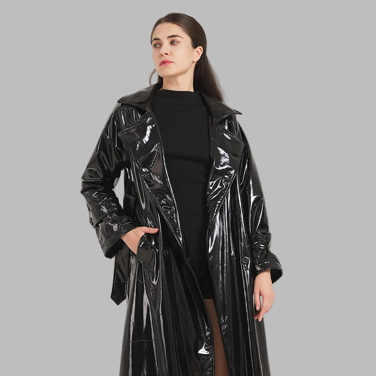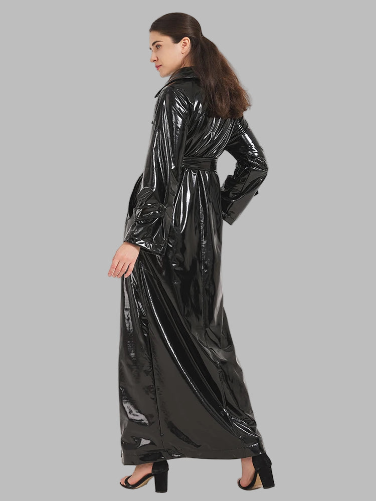 Ilgas juodas lakuotas odinis moteriškas goth stilius paltas