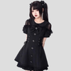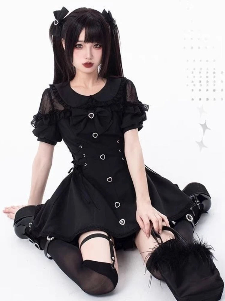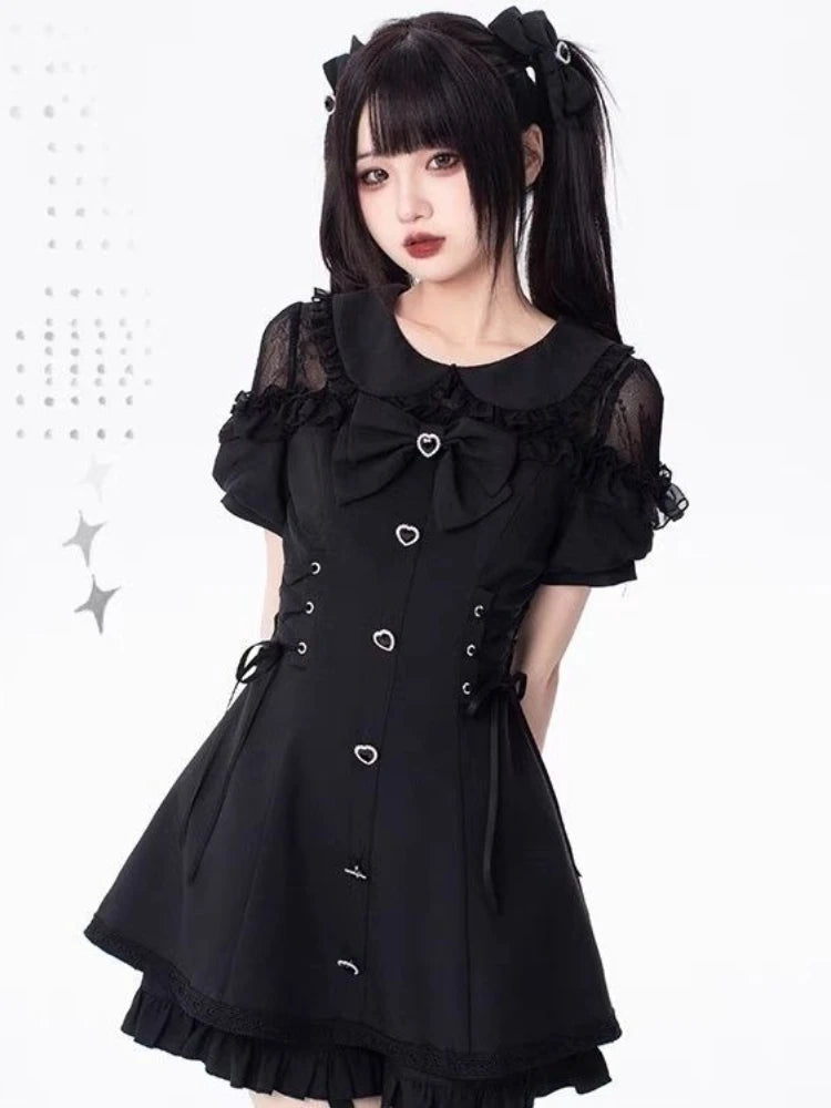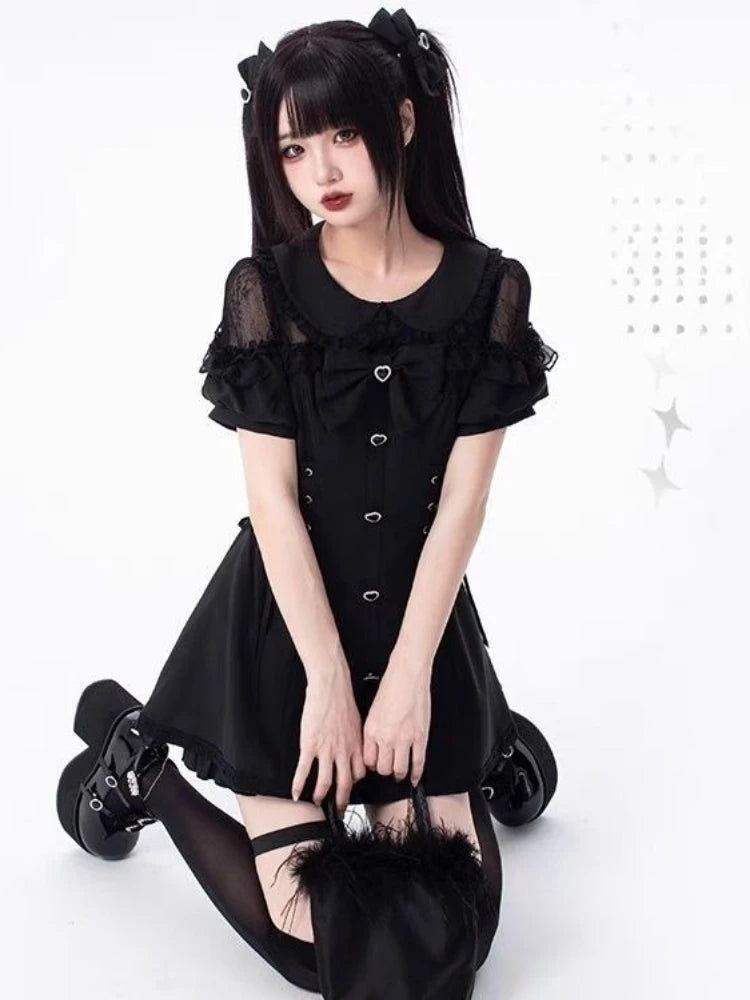 Jirai Kei juoda suknelė su širdies formos sagomis ir raukiniais