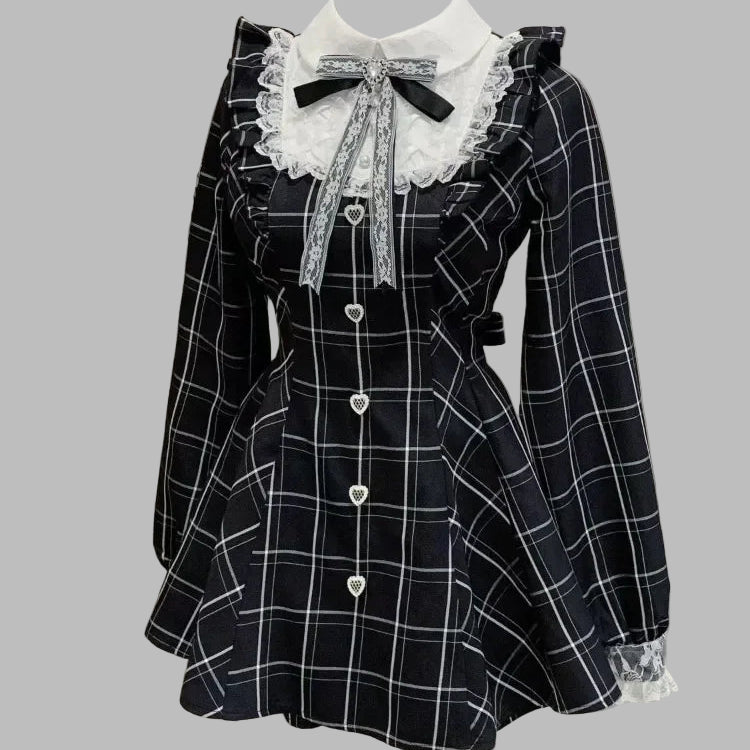 Jirai Kei Juodos spalvos languota suknelė su nėriniuotu jabotu