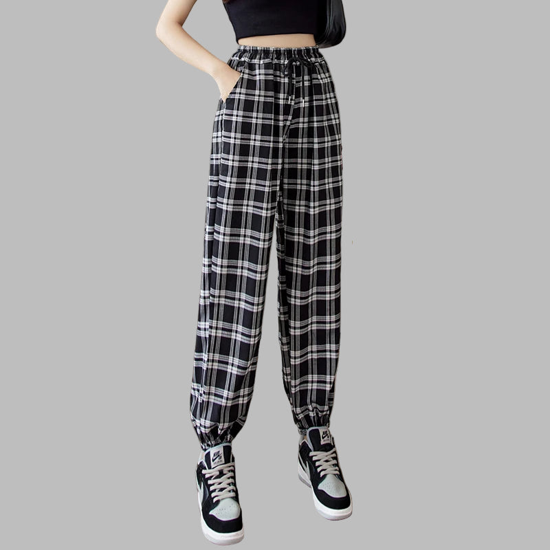 Jirai Kei juodos ir baltos spalvų languoti jogger tipo kelnės Peržiūrėti parinktis