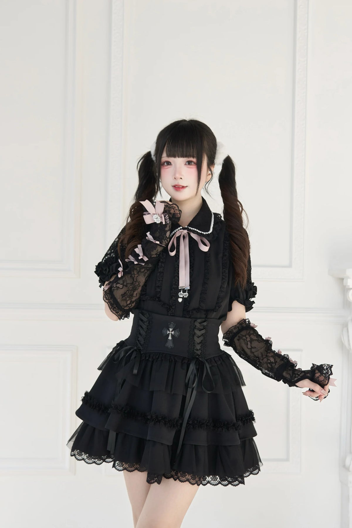 Jirai Kei juodos kojinės su rožiniais kaspinėliais Kawaii Lolita