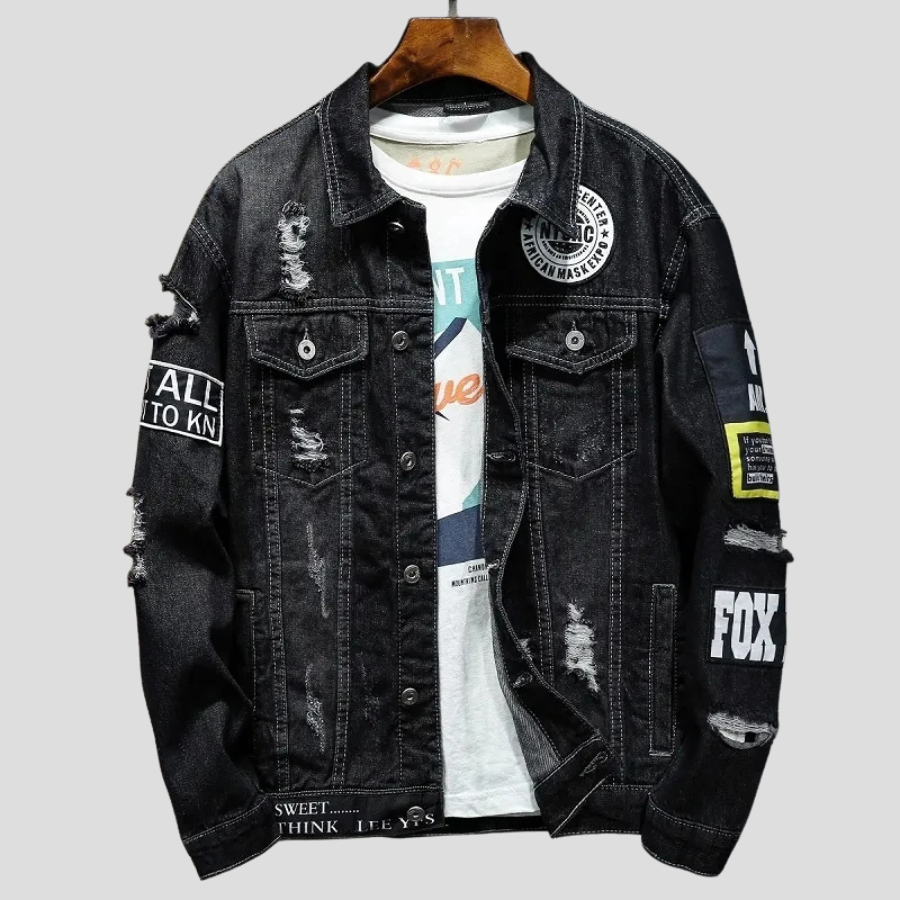 Juoda džinsinė striukė su punk rock stiliaus lopais Peržiūrėti parinktis