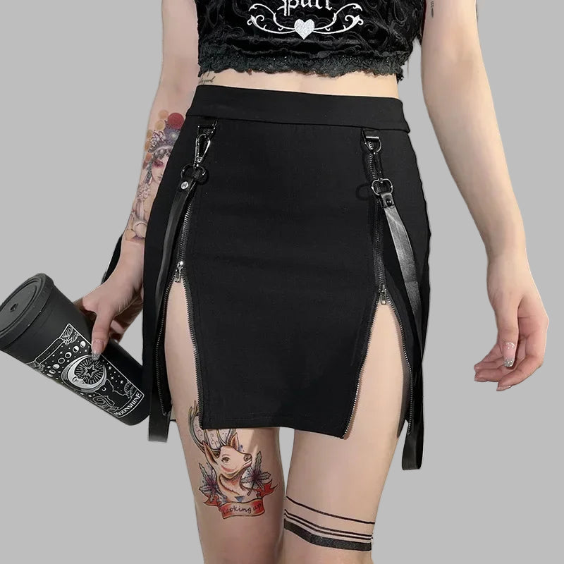 Juoda gotikinė mini sijonas su užtrauktukais ir dirželiais straps