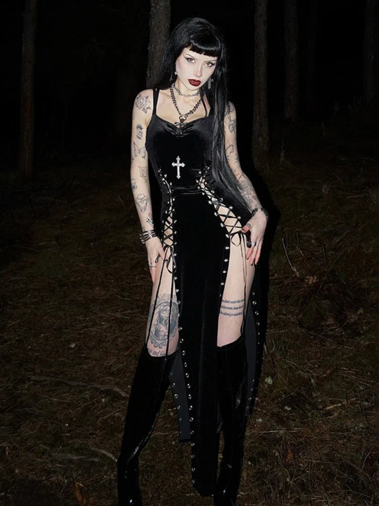 Juoda grunge punk stiliaus suknelė su skeltuku, kryžiumi ir tinkleliu