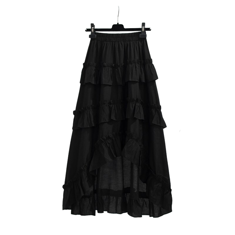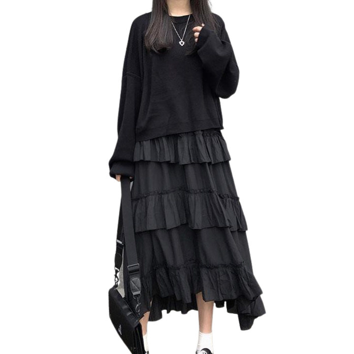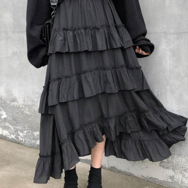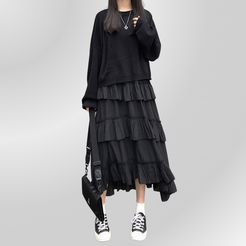 • Ilgas ir platėjantis sijonas: idealus vėsesnėms dienoms, tamsi estetika