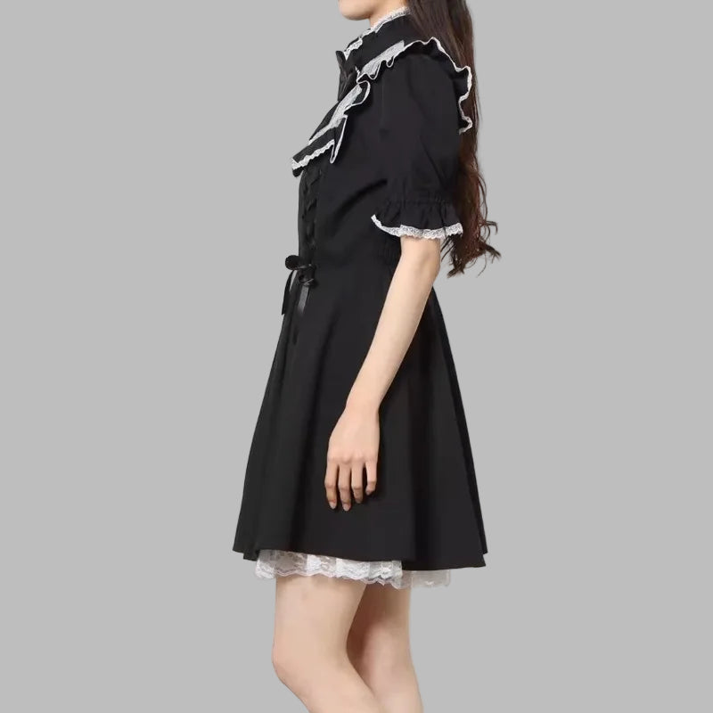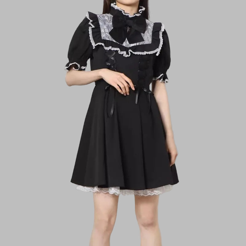 Juoda Jirai Kei suknelė su nėriniuotu kaspinu ir raišteliais