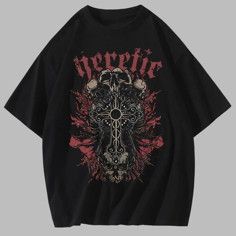 Juoda metalinė marškinėliai su kryžiumi ir kaukolėmis