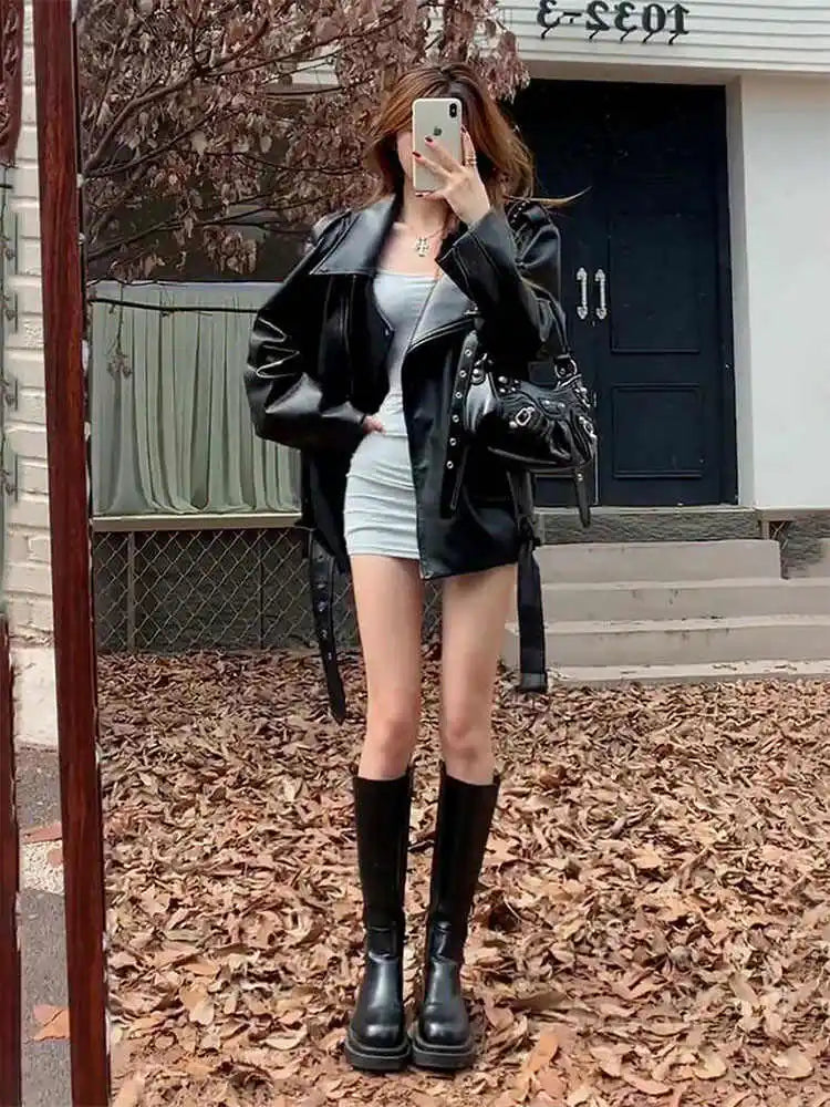 Juoda odinė gotikinė punk metalinė oversize striukė