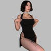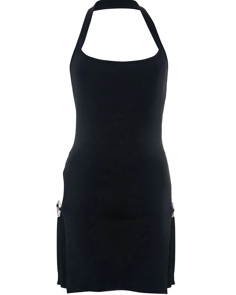 Juoda punk rock mini suknelė su halteriu ir sagtimis