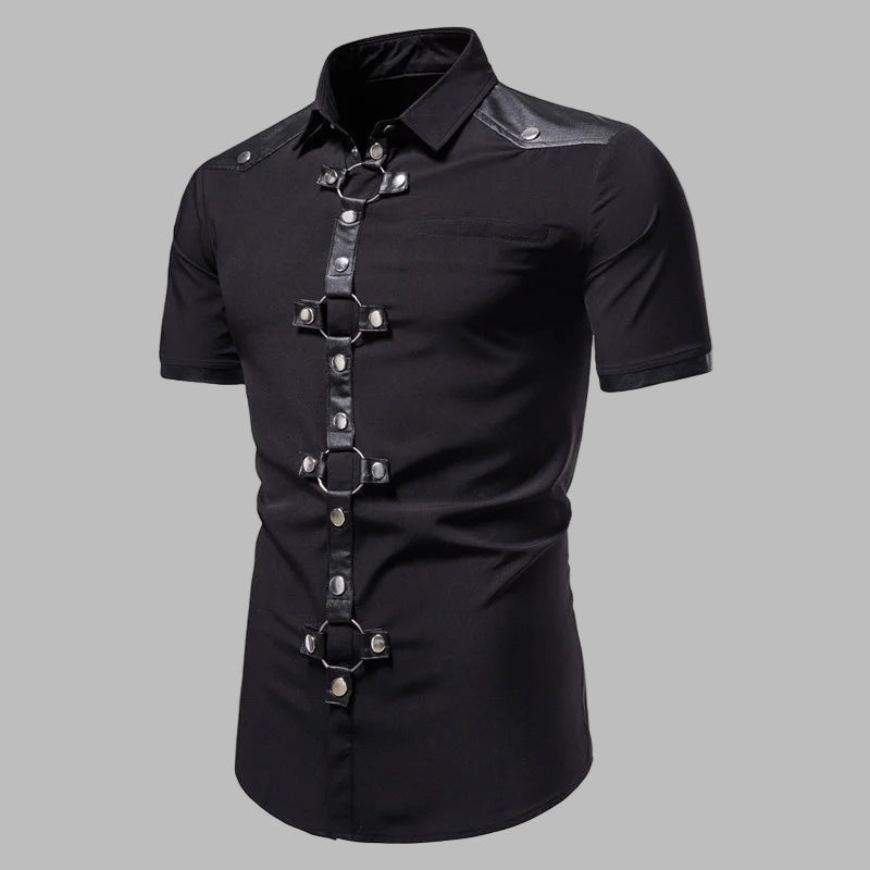 Punk marškiniai su metaliniais žiedais ir dirželiais trumpomis rankovėmis juoda