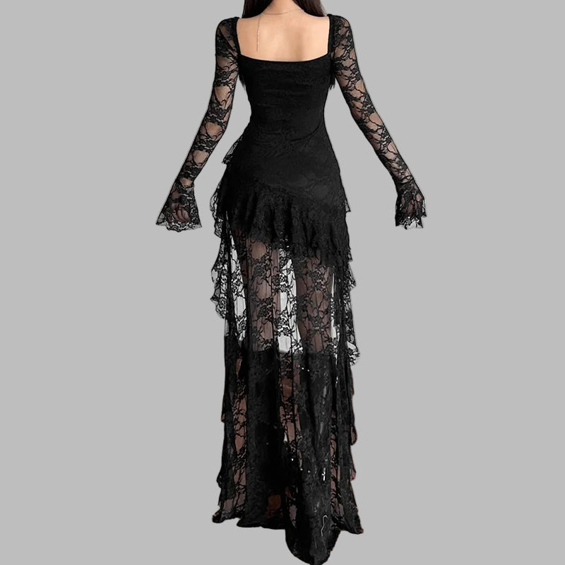 Juoda Rock suknelė su nėriniais ir asimetrišku apačia