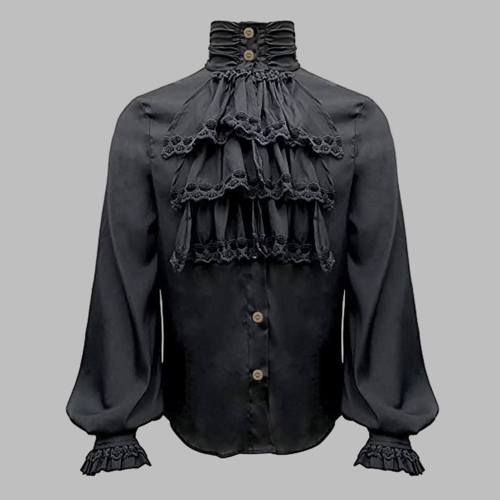 Juoda steampunk stiliaus palaidinė su nėrinių raukiniais ir aukšta apykakle