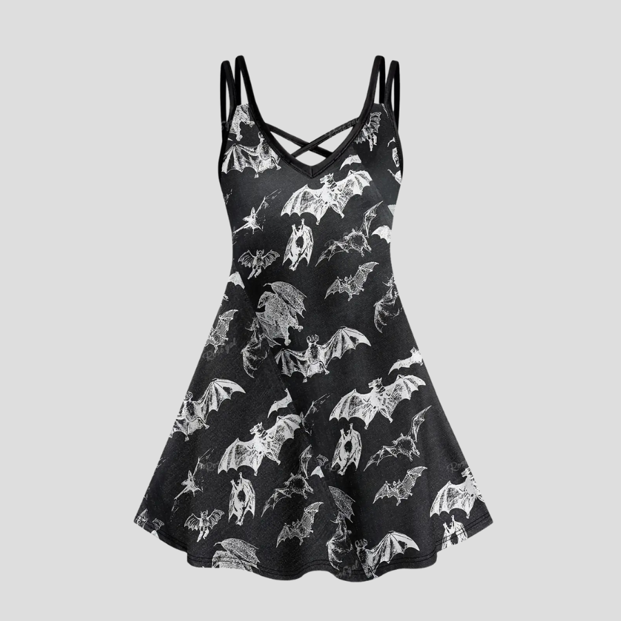 Czarna Sukienka Metal z Nietoperzami na Ramiączkach Krzyżowych
