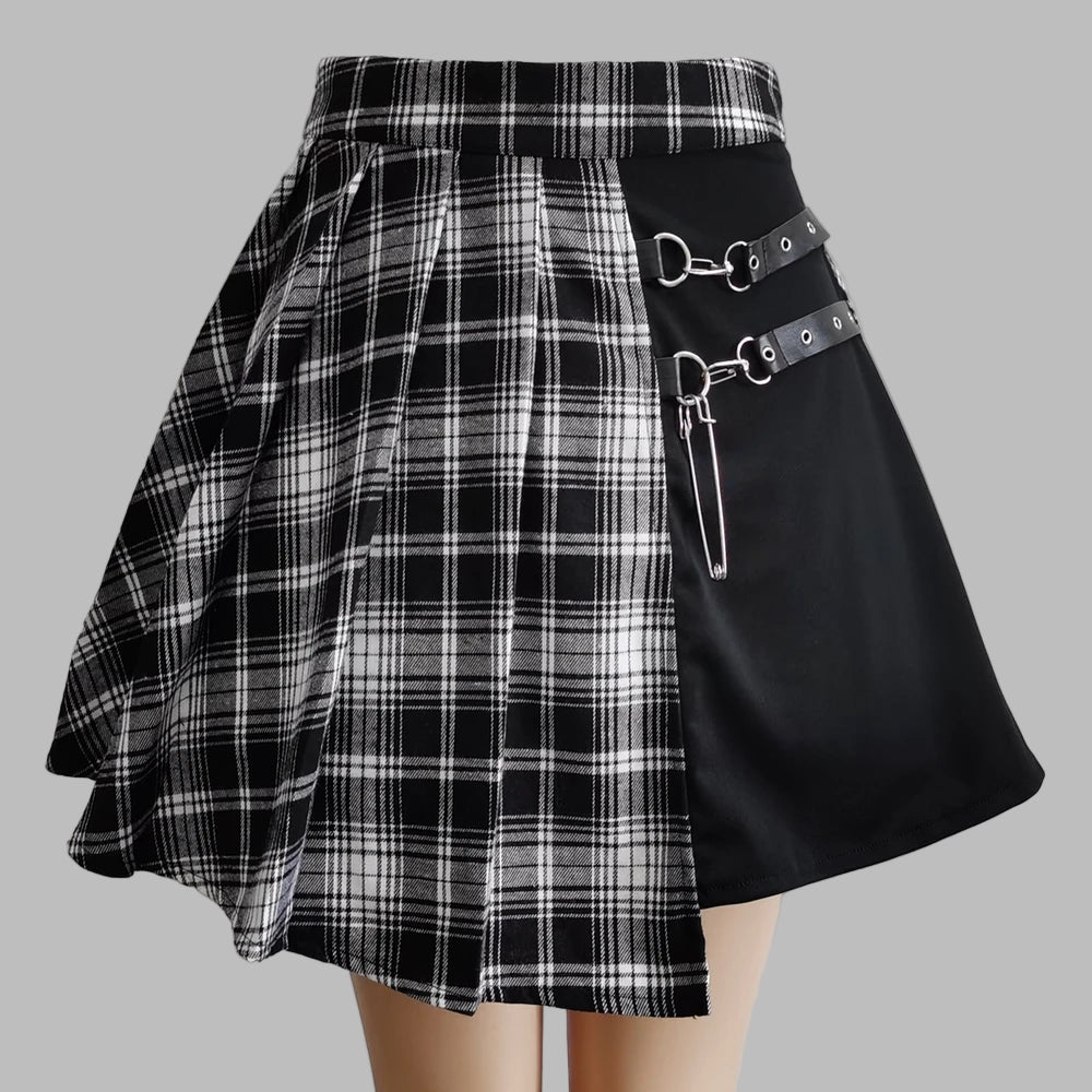 Juodai balta grunge punk rock stiliaus sijonas su dirželiais ir kniedėmis