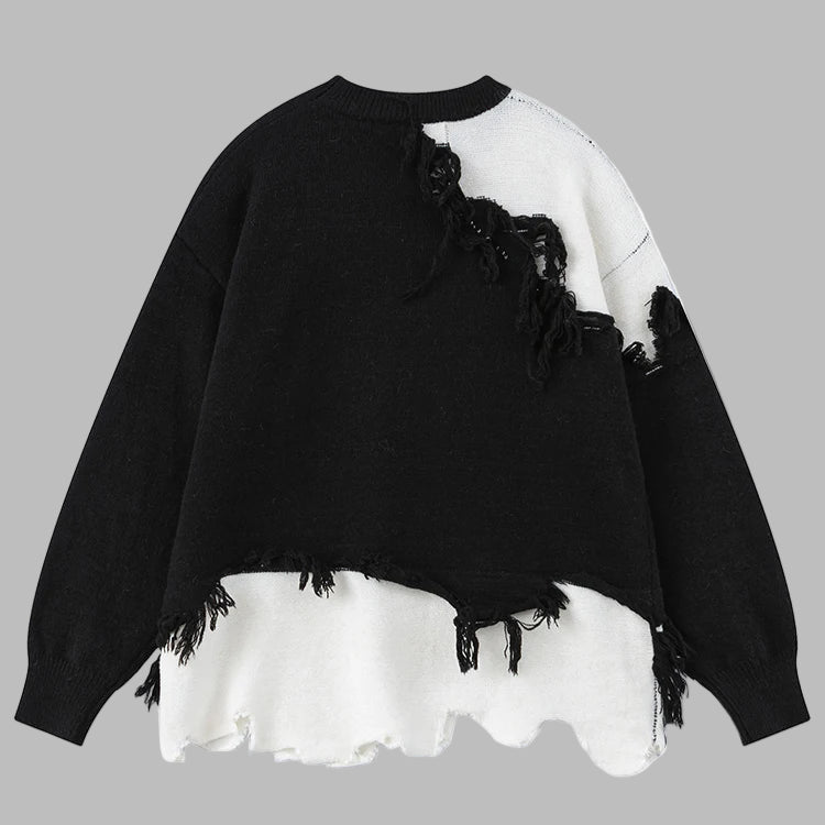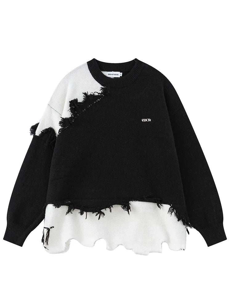 Juodai baltas punk stiliaus megztinis su įplyšimais ir kutais Peržiūrėti parinktis