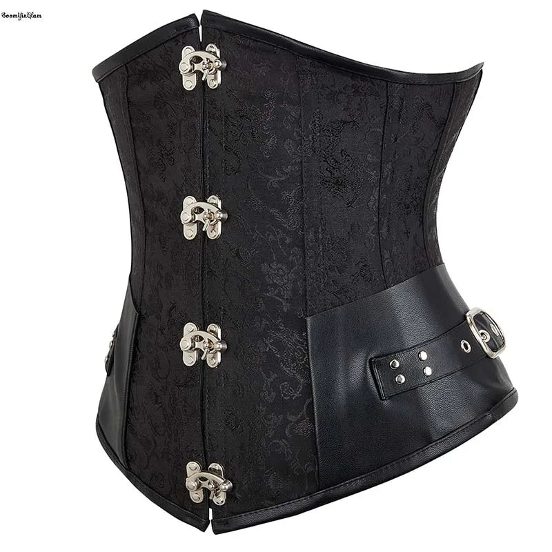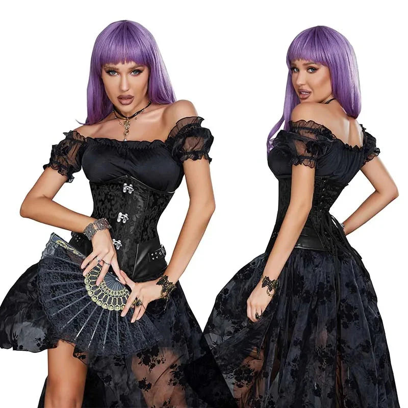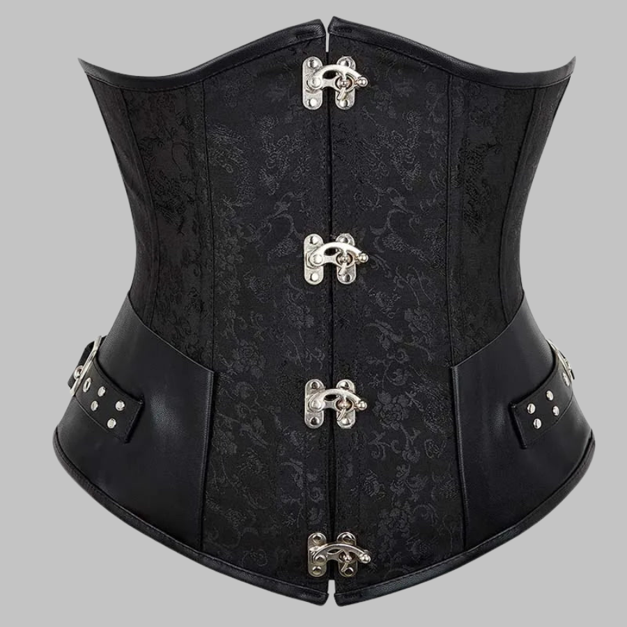 Šis steampunk stiliaus po krūtine korsetas su išraiškingu dizainu puikiai formuoja figūrą su charakteriu. Įrengtas su 12 plieninių kaulų, užtikrina stiprų palaikymą ir liemens liekninimo efektą. Idealiai tinka renginiams, vakariniams išėjimams, cosplay ar kaip stiprus akcentas kasdienėje aprangoje. Komplekte yra derančios spalvos stringai.