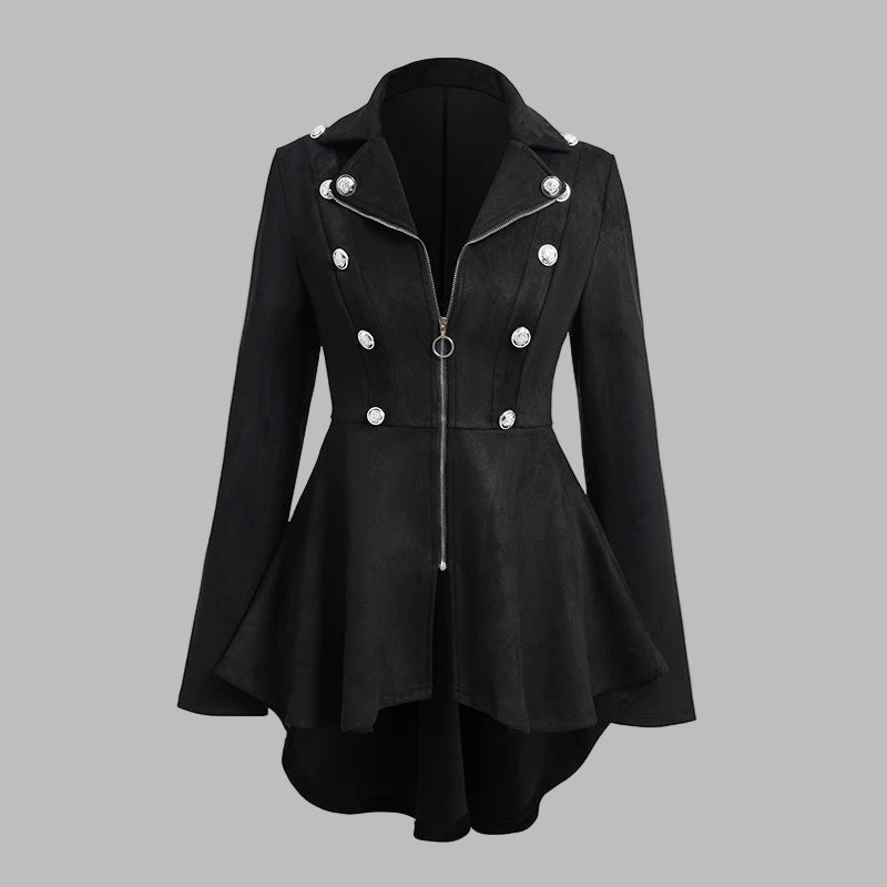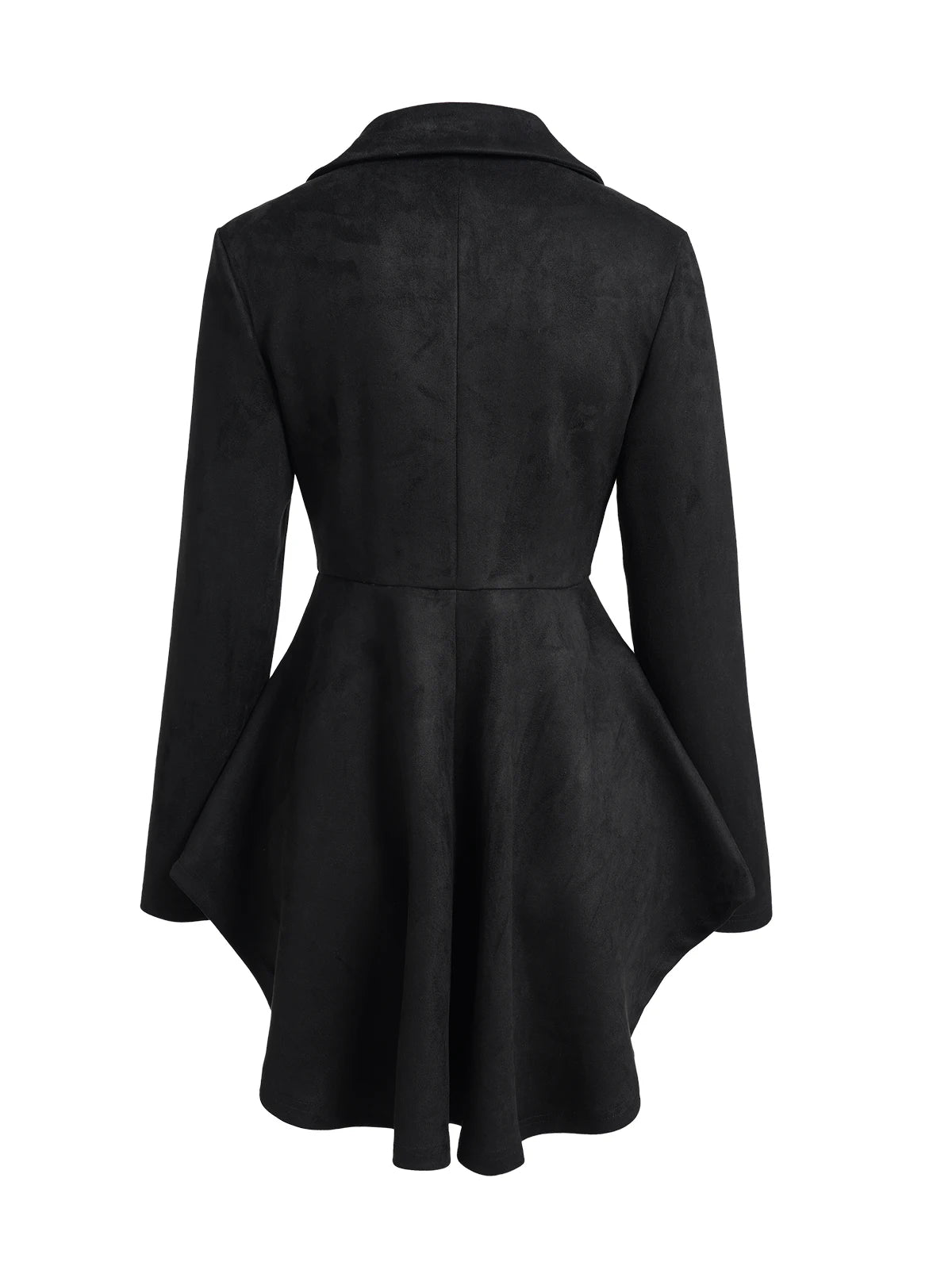 Juoda gotikinė moteriška paltas su klostėmis, sagos ir užtrauktukas