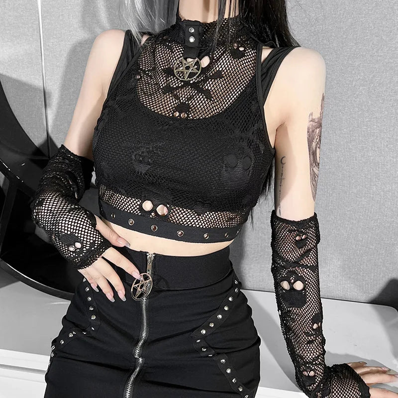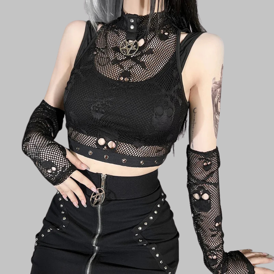Juodas gotikinis tinklelio viršus su kaukolės atspaudu ir tinklinėmis rankovėmis