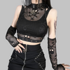 Juodas gotikinis tinklinis viršus su kaukolės atspaudu ir tinklelio rankovėmis
