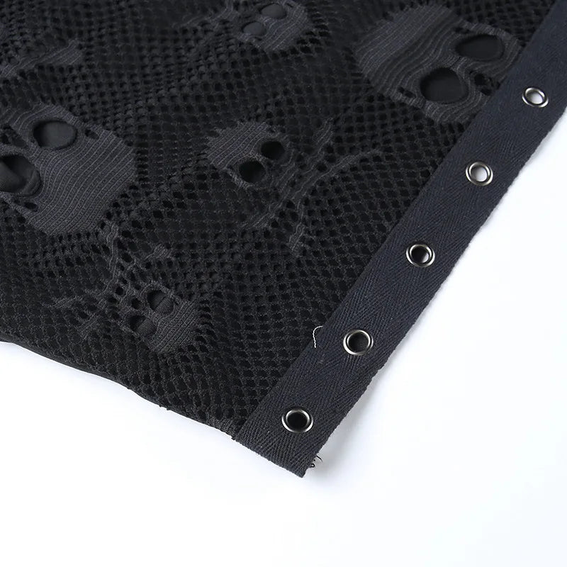 Juodas gotikinis tinklelio viršus su kaukolės atspaudu ir tinklelio rankovėmis