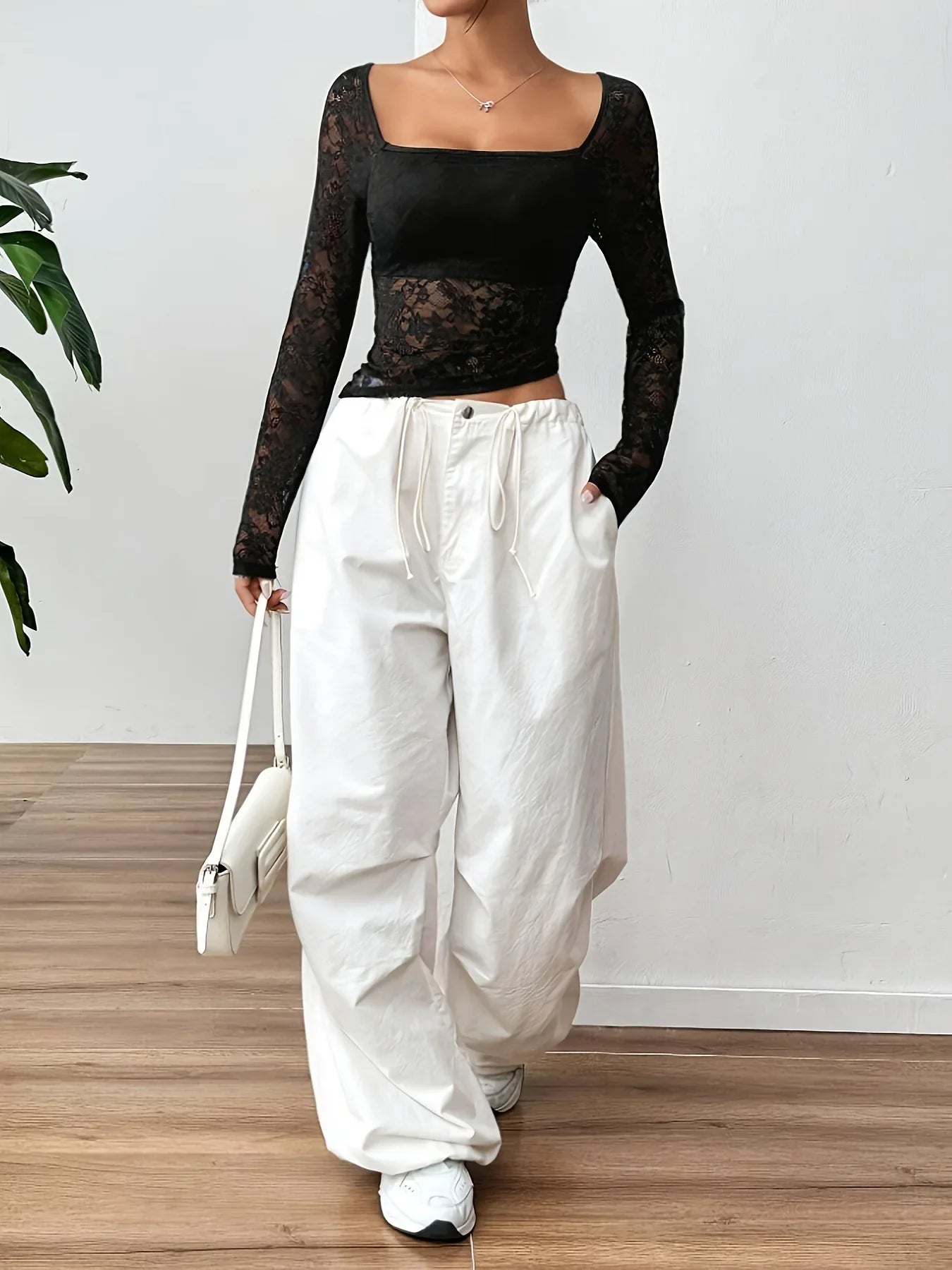 Juodas prigludęs permatomo nėrinio viršus ilgomis rankovėmis