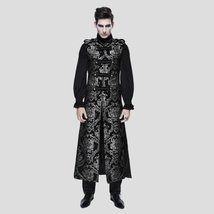 Juodas steampunk gotikinis paltas su brokato raštu ir diržais