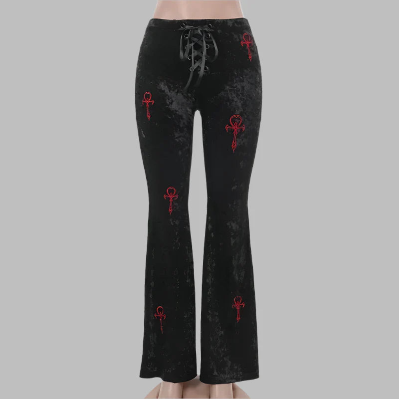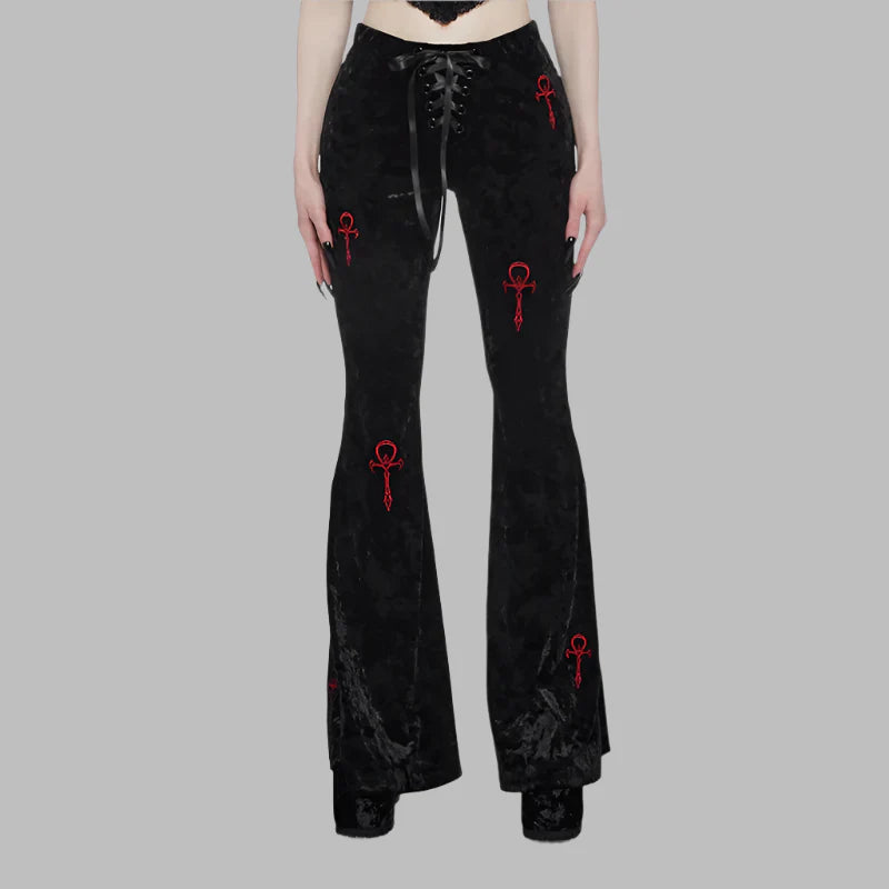 Juodi gotikiniai aksominiai aukštos juosmens kelnės su raudonais siuvinėtais kryžiais