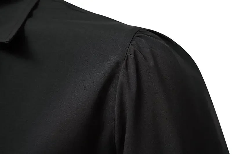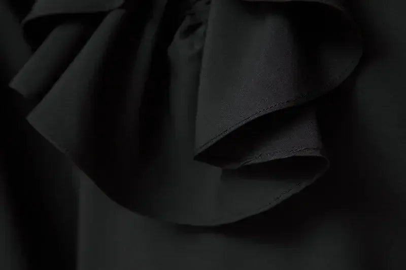Juoda roko stiliaus palaidinė su nėriniuotomis rankogaliais ir jabotu