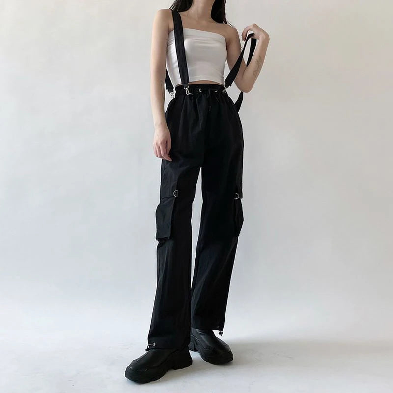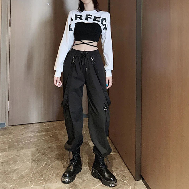 Juodos gotikinės kargo kelnės su metalinėmis punk rock detalėmis