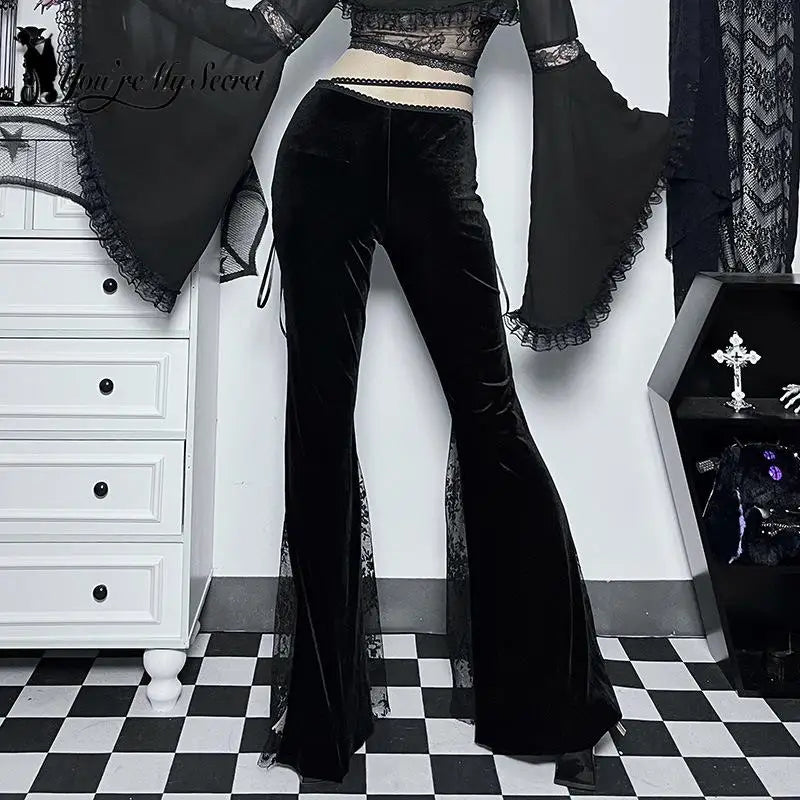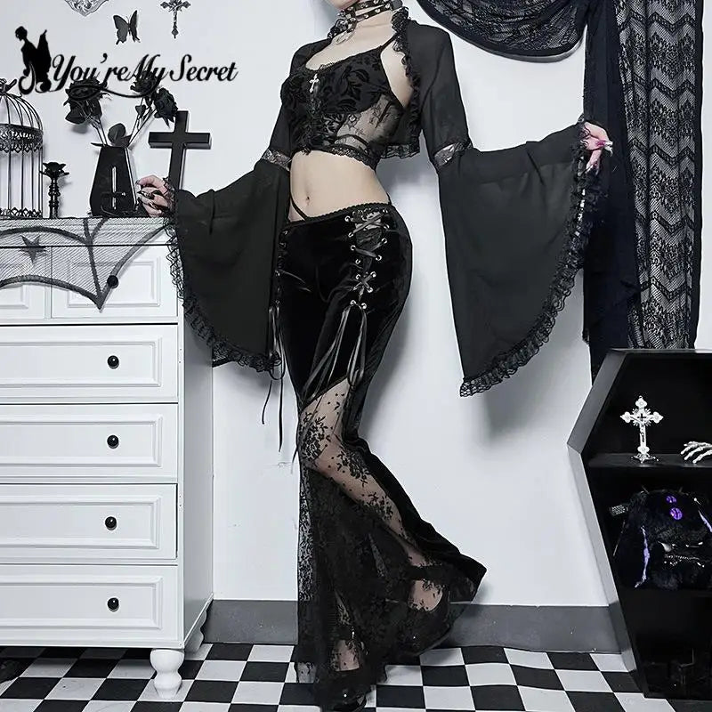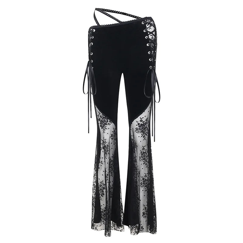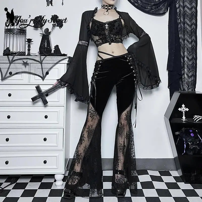 Juodos gotikinės kelnės su įpjovomis ir nėrinių detalėmis