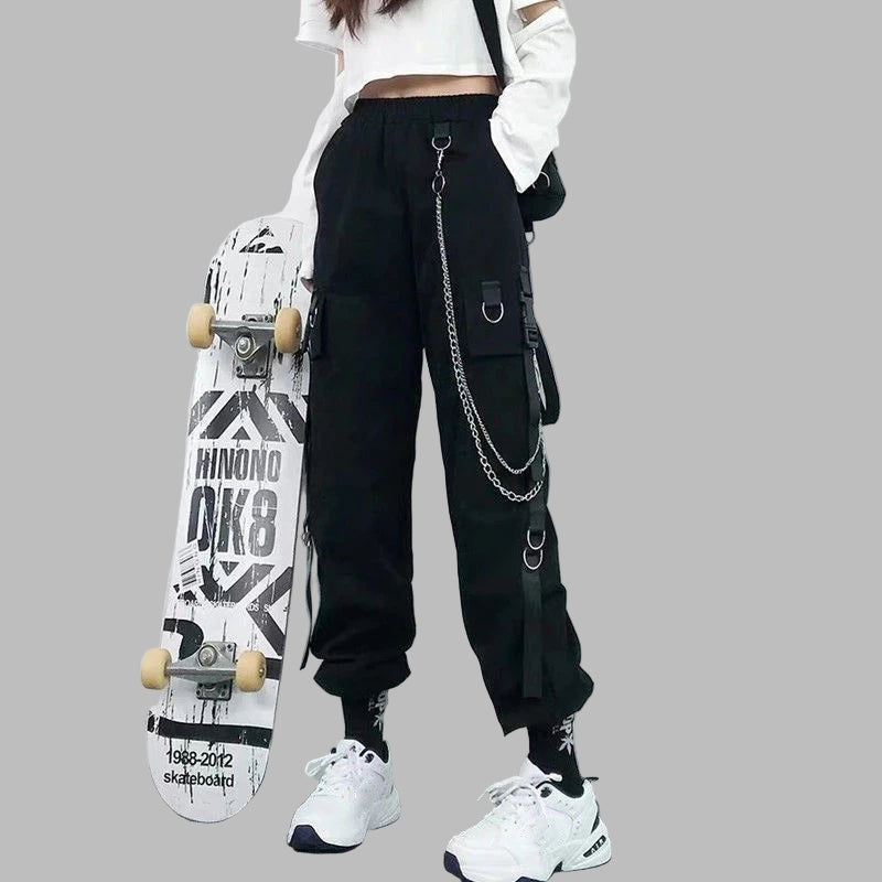 Juodos gotikinės punk kelnės su grandinėmis ir cargo kišenėmis metalinės